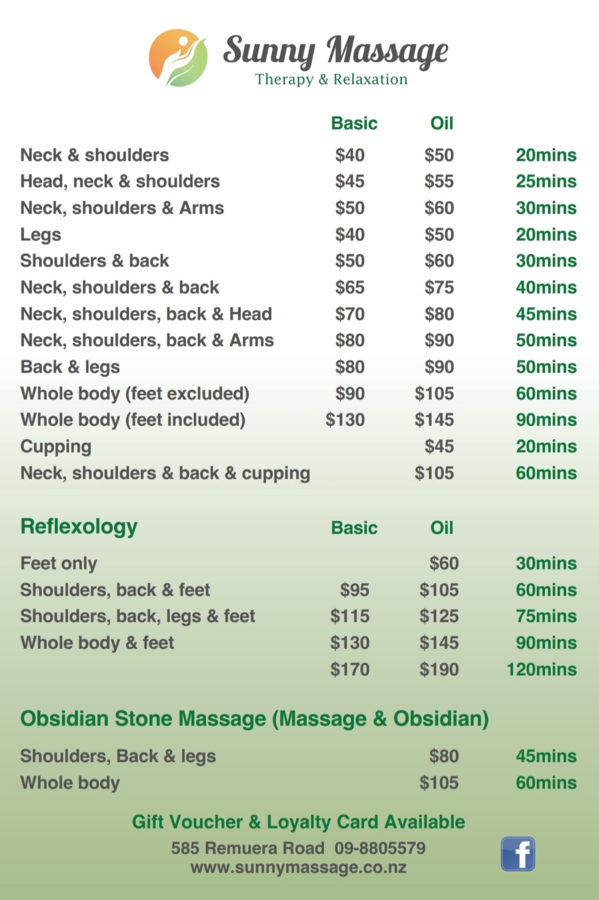 Oil massage: $60/30mins (Shoulders &back), $105/1hour(whole body), $125/75mins(Shoulders,back,legs& feet), $145/90mins (90mins whole body can include feet or cupping or Obsidian stone Massage)